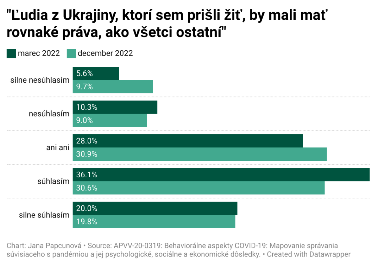 Tento trend potvrdil aj decembrový prieskum SVÚ CSPV SAV, v. v. i., ktorý zopakoval svoje zisťovanie z marca 2022. „Respondentov a respondentky sme v oboch mesiacoch oslovili s viacerými otázkami. Zaujímalo nás napríklad, či by podľa nich Ukrajinci a Ukrajinky, ktorí prišli na Slovensko žiť, mali mať rovnaké práva ako všetci ostatní. Zatiaľ čo v marci s týmto vyjadrilo nesúhlas približne 15 percent opýtaných, v decembri už takto reagoval každý štvrtý opýtaný respondent. Pričom počet tých, ktorí zvolili odpoveď „silne nesúhlasím“, sa takmer zdvojnásobil,“ spresňuje psychologička Jana Papcunová zo SVÚ CSPV SAV, v. v. i.