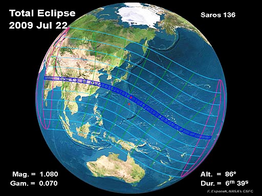 V stredu 22. júla 2009 nastane úplné zatmenie Slnka. Najdlhšie v tomto storočí. Na Marshallovych ostrovoch medzi ostrovom Iwo Jima a korálovým atolom Eniwetok (angl. Enewetak) bude trvať až 6 min 39 s. Po východe Slnka bude pás úplného zatmenia (takzvaný pás totality) postupne prechádzať od severozápadnej časti Indie, cez východný Nepál, Bangladéš, Bhután, Barmu, centrálnu časť Číny a a skončí sa pri západe Slnka v Tichom oceáne (obr. 1). Ako čiastočné bude pozorovateľné z takmer celej východnej Ázie, Indonézie a Tichomoria. Z Európy zatmenie pozorovateľné nebude.