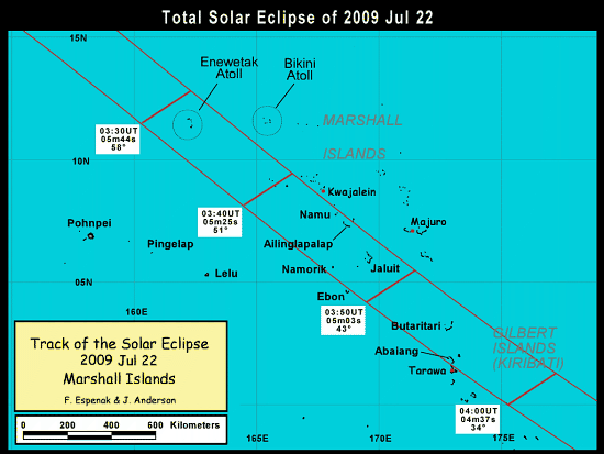 Podľa časového harmonogramu naši vedci štartujú z Tatranskej Lomnice v sobotu 11. júla o 6-tej ráno cez Poprad, Bratislavu, Viedeň a Salzburg do Mníchova, odtiaľ v nedeľu 12. júla odletia do San Francisca a Honolulu. V stredu 15. júla pokračujú v ceste na ostrov Majuro, ktorý je tiež súčasťou Marshallovych ostrovov a odtiaľ 18. alebo 19. júla odletia na ostrov ENIWETOK, kde 22. júla budú pozorovať slnečnú korónu. Úplné zatmenie Slnka nastane okolo 14,30 miestneho času. U nás, na Slovensku, bude vtedy 5,30 h ráno, ale zatmenie neuvidíme ani len ako čiastočné. Priamo na ostrove Eniwetok, kde bude mať svoj tábor aj expedícia zo SAV, bude úplné zatmenie Slnka trvať 5 minút a 44 sekúnd pri výške Slnka 58 stupňov nad obzorom. Pozemské pozorovania sa budú koordinovať s pozorovaniami na družiciach TRACE a Hinode, na kozmických sondách SOHO a STEREO a tiež s pozorovaniami kolegov v Číne (Hvezdáreň Upice).