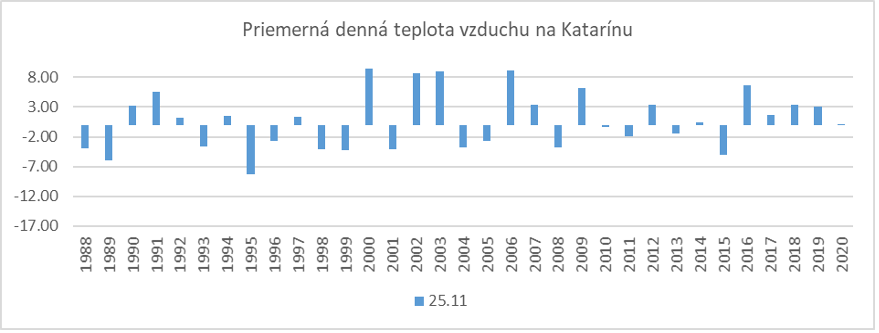 „V roku 2021 sme Katarínu mali na meteorologickej stanici na blate. Najbližšia predpoveď počasia SHMÚ pre liptovský región predpovedá na Vianoce sneženie a teplotu vzduchu pod -10 °C. Pranostika pre tento rok by sa teda mohla opäť potvrdiť,“ nádeja sa vedec.