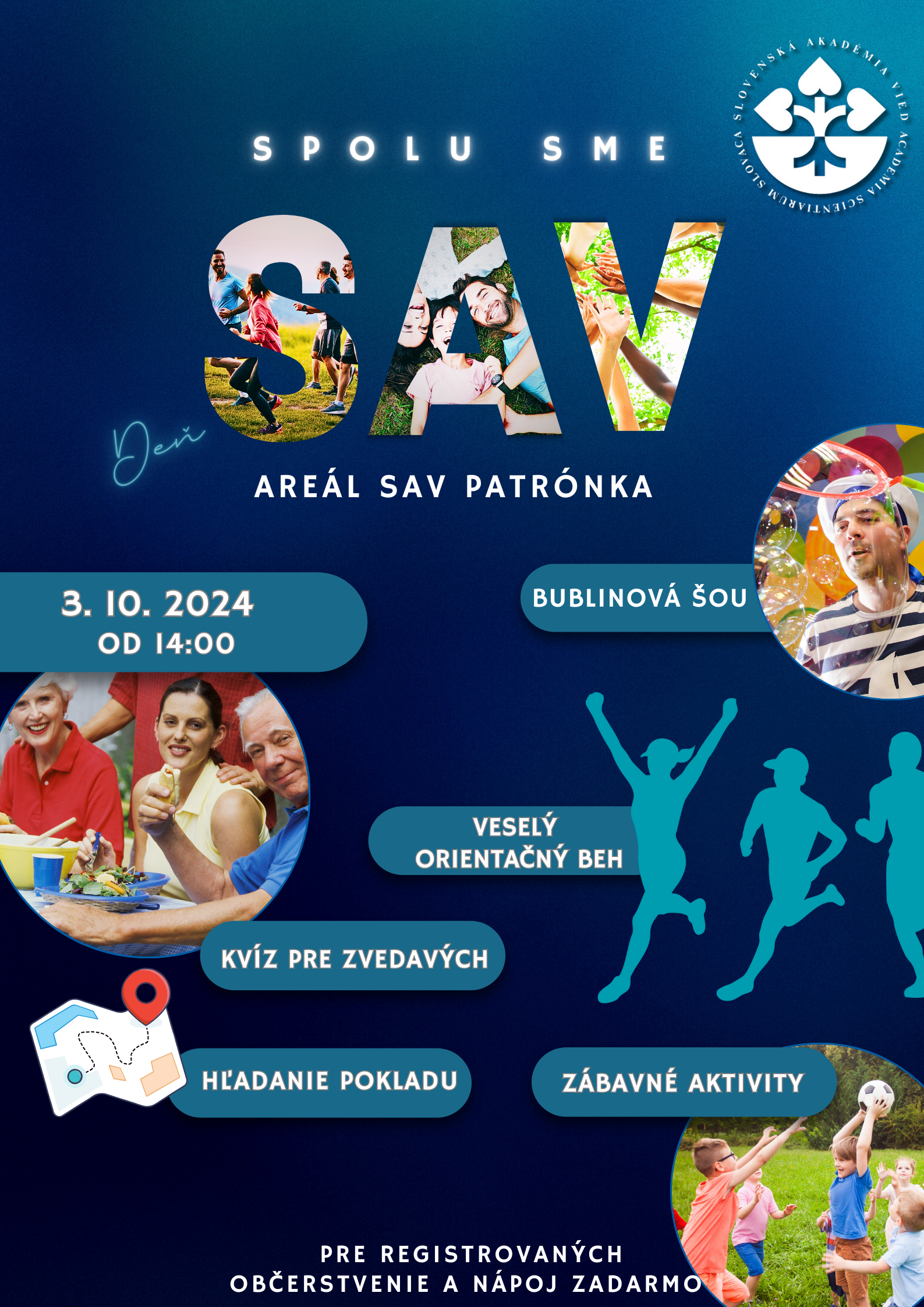 Spolu sme SAV je čas pre Vás, našich kolegov aj blízkych. Spolu budeme mať príležitosť prehodiť pár slov, spoznať nových ľudí, či priamo osloviť členov predsedníctva SAV. Zábavné pohybové aktivity rozprúdia krv dospelým aj deťom. Čaká nás hľadanie pokladov, súťaž v orientačnom behu jesenným areálom, aj interaktívny Kvíz pre zVEDAvých z dielne Mladých vedcov. Vo viacerých súťažiach môžete vyhrať pekné ceny. V pripravenom fotoateliéri sa budú môcť odfotiť nie len víťazi a výhercovia súťažných disciplín. Vtipnú fotku si môže odniesť každý, kto chce mať spomienku na náš spoločný deň. Deti si vyskúšajú bublinovanie, šou majstra bublinára však zabaví aj dospelých. Celým podujatím nás bude sprevádzať moderátor Martin Chynoranský.