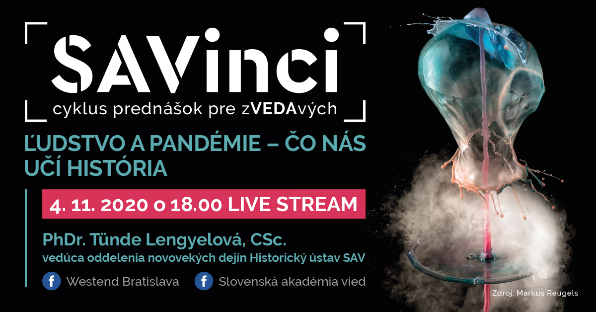 LIVE STREAM SAVinci prednášky Ľudstvo a pandémie – čo nás učí história s Tünde Lengyelovou sa začína v stredu 4. novembra o 18. h na facebookových stránkach Slovenskej akadémie vied a Westendu.